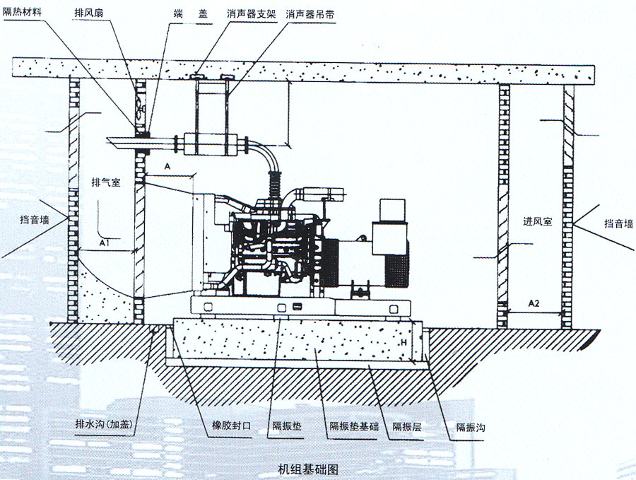固定式柴油發電機組一般安裝在機房內使用,因此機房設計的正當與否會對機組的運行、周圍環境及工作人員產生較大影響,故應采取相應的環保措施降低機房噪音,從而減小其影響。 發電機房的設計是一個綜合工程,需要考慮的事項包括: 發電機房的位置和面積 發電機房一般安排在易于通風、方便安裝設備;干燥,不易因洪水或大雨浸水,而且遠離對噪音有要求的建筑物。機房的面積應考慮充足的空間,便于人員操作維修。 基礎 發電機組的安裝基礎根據安裝的位置不同而定,具體可以分為混凝土基礎和平板基礎兩種。在廠房等平房建筑物采用混凝土基礎,在高層建筑物的樓房采用平板基礎。